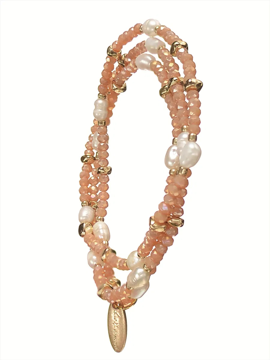 This versatile elasticated wrap around can be worn as a triple layer bracelet or necklace. Crafted from pink coloured beads with pearls.
