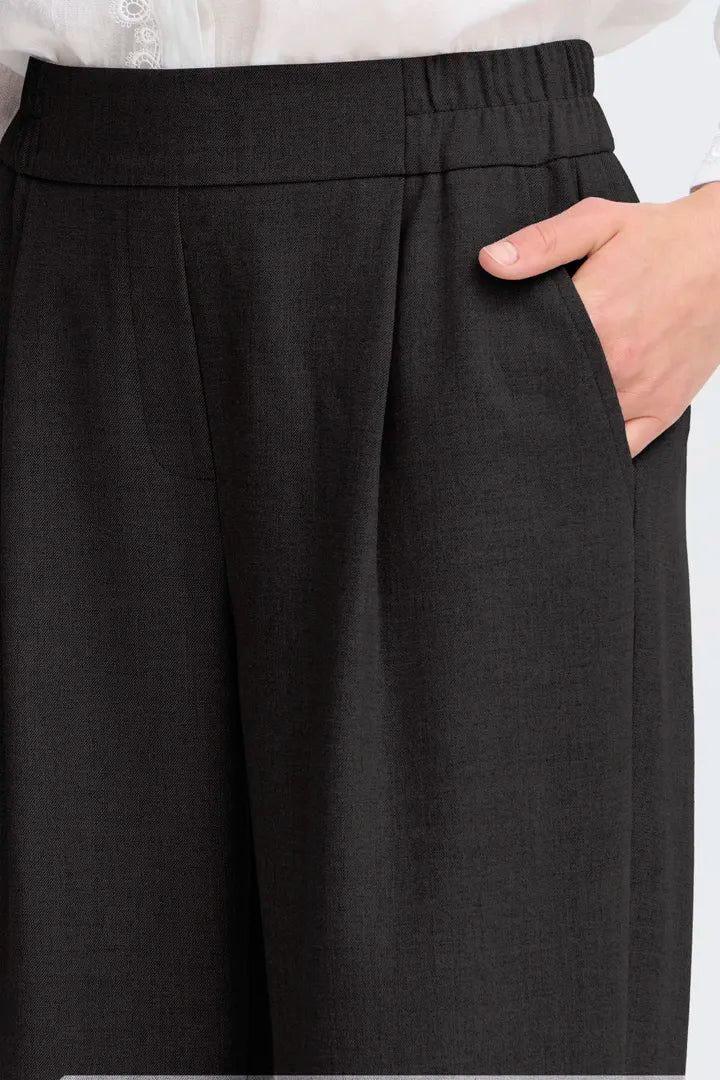 A sleek, wide‑leg black trouser with an easy elasticated waist, offering effortless comfort and a polished, modern drape.