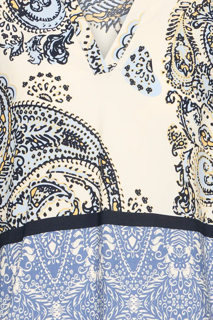 Printed V‑neck blouse with a mix of bold paisley and intricate floral motifs, finished with three‑quarter sleeves and contrast trim. A standout piece that brings effortless colour and pattern to everyday styling. Matching trousers available.