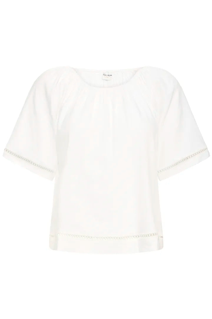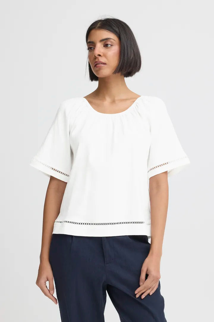 A crisp white lightweight linen‑mix blouse with a relaxed, easy drape, finished with wide short sleeves and delicate cut‑out trim along the edges. The natural texture of the fabric gives it a soft, airy feel—ideal for warm days or effortless layering.