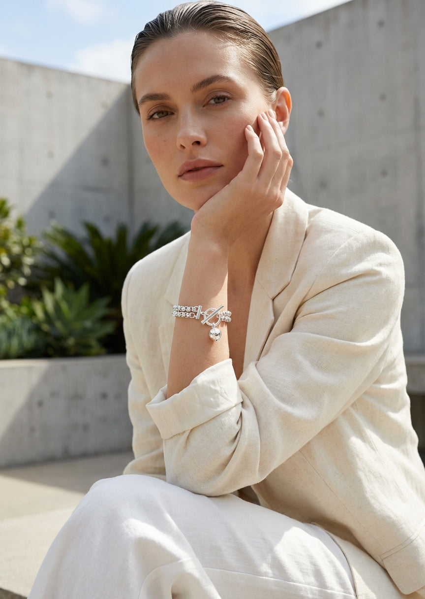 Envy Silver linked bracelet with ball charm and a decorative toggle clasp